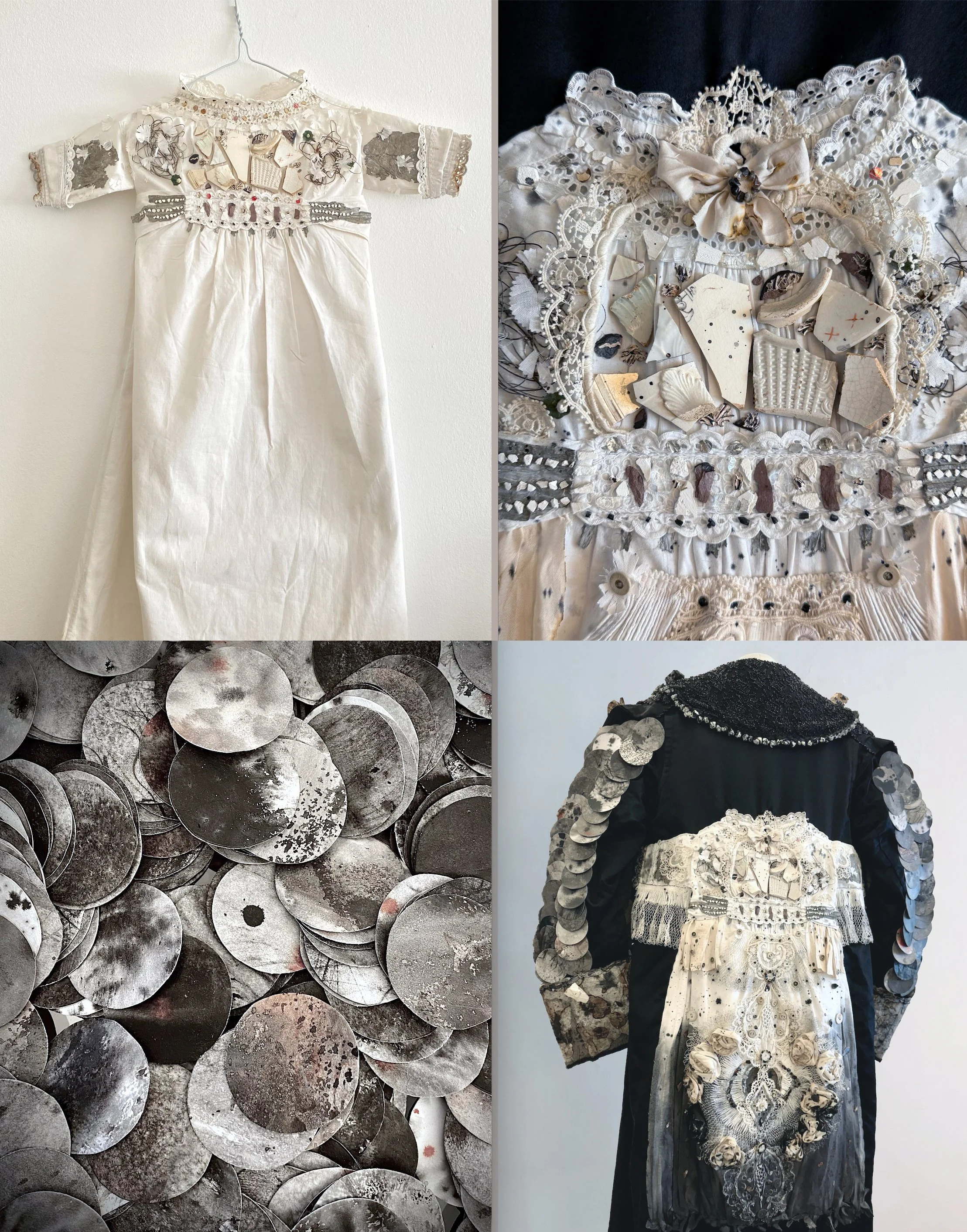 For the war child born from fire and ashes, I transformed an antique baby gown with flames and adorned it with debris and other remnants collected over the years, such as old lace doilies, a bonnet, buttons, rusted wires and pottery shards. I have created a heavy landscape of destruction on the baby gown symbolising purity and innocence. It is placed at the back of the mourning coat as a poignant reminder of the responsibility we bear as we assume the weight of the child’s future in the face of adversity and calamities.