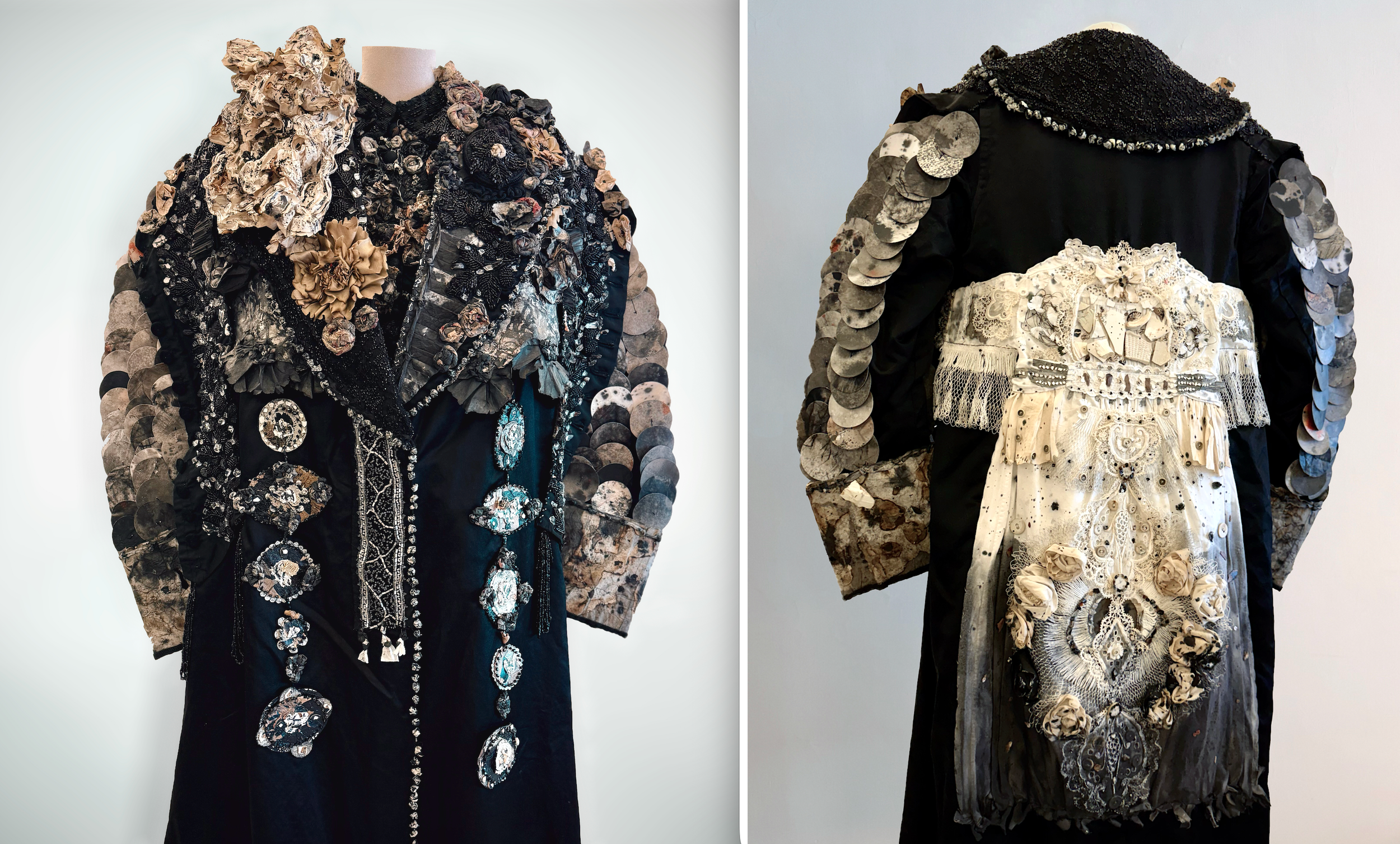 Inside, a sense of disarray and destruction permeated the space. My work consisted of contemporary pieces carefully placed among a hundred-year-old collection of jet beads and trimmings. The pictures show the materials I used on the coat. The broken glass pieces are contemporary and are placed between the antique jet beads. The large flower on the lapel is papier-mâché while the small silk flower is made from remnants of a Victorian parasol. Many of the sewn embellishments are created from paper sourced from various Chinese ink drawings I prepared beforehand.