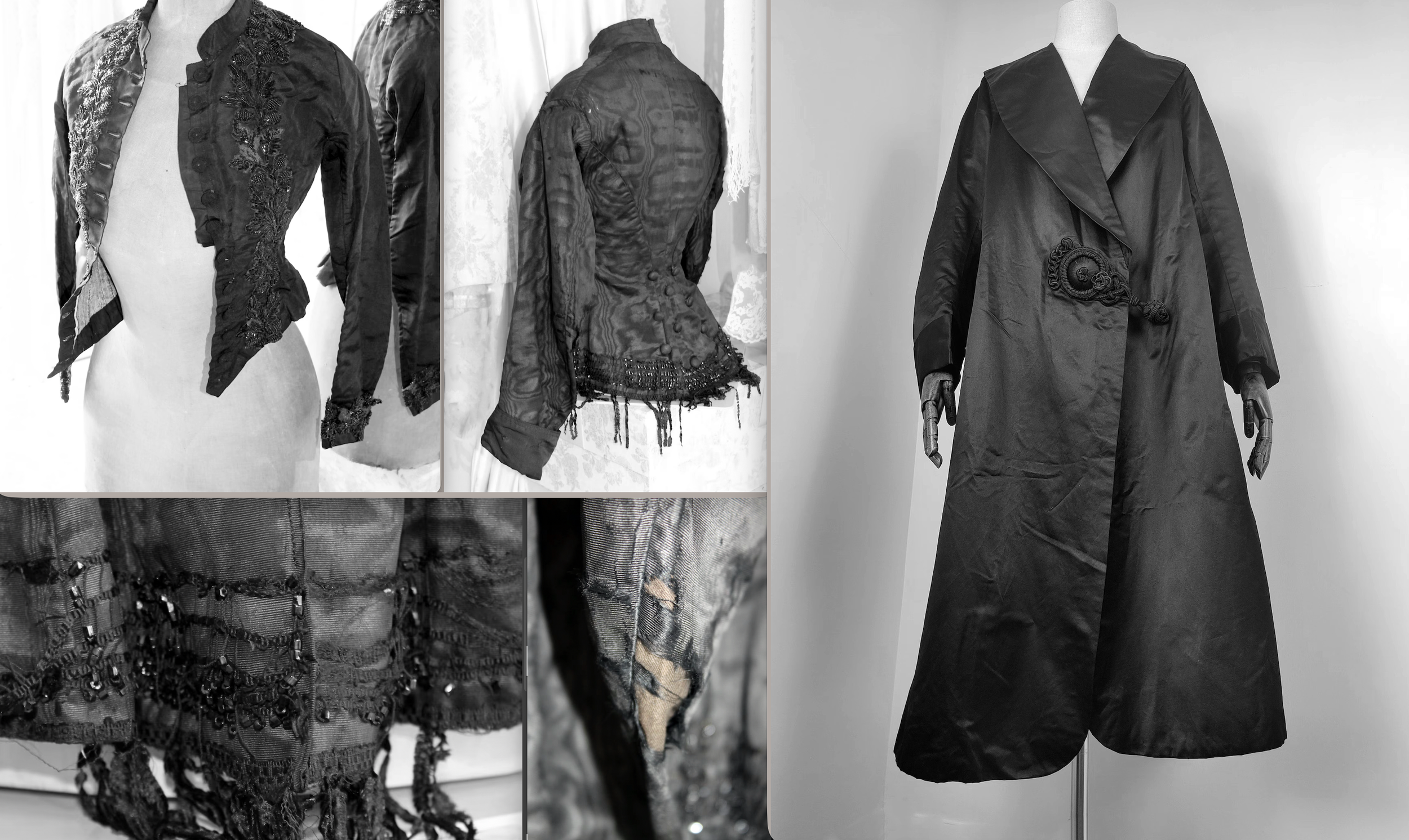 In mid 2023, I acquired a beautiful Edwardian black silk coat and two black moire taffeta jackets from the Victorian era in the UK. Victorian mourning, dating back to the late 1800s, originated with Queen Victoria’s black crepe, jet and onyx garments. These set a Western precedent for mourning attire.