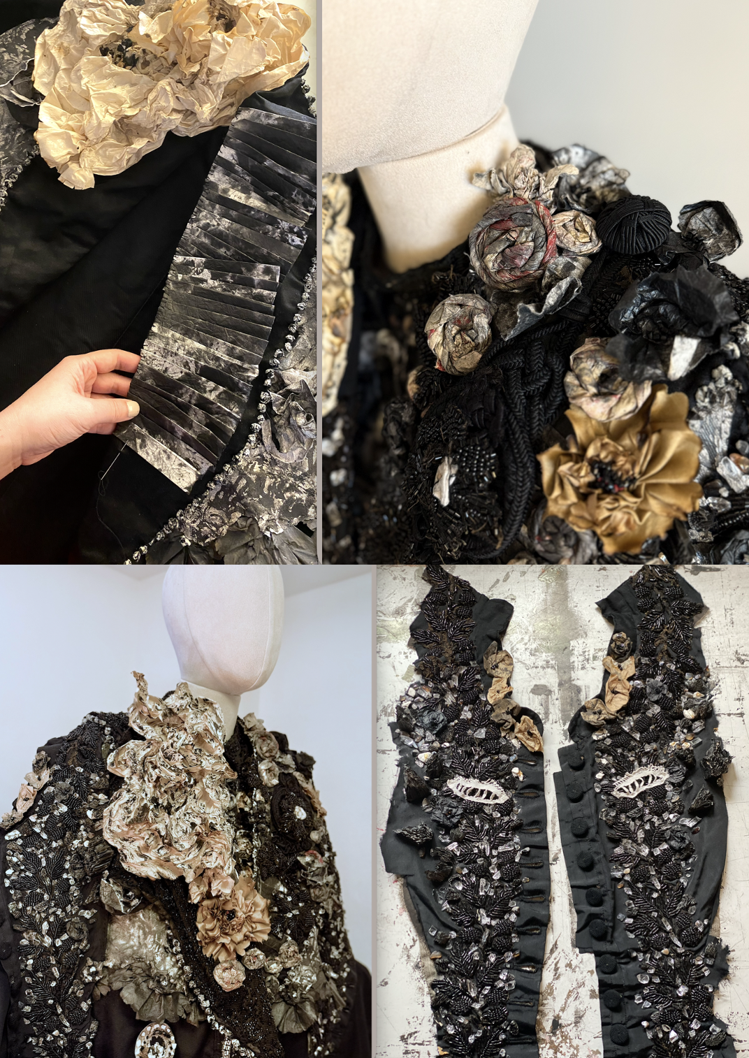 I prepared the jacket with various decorations. I began by drawing ink on Xuan paper and shaping it into flowers, then sewing them with jet beads onto the taffeta, which was prepared with old netted white dollies treated with Chinese ink to deepen the visual impression. I also added small flowers crafted from remnants of black rubbish bags, masking tape and other discarded materials. The repetitive process of drawing sculpting and sewing was a fascinating creative experience. I’ll delve deeper into this in my next coat-making post.